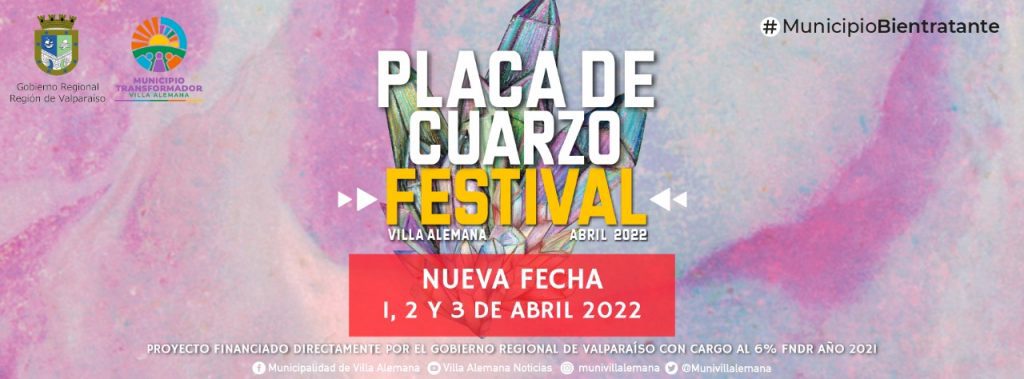 El evento “Placa de Cuarzo Festival”, organizado por la Municipalidad de Villa Alemana, fue postergado para el mes de abril, con el fin de proteger a los vecinos y vecinas de los aumentos de contagios de COVID-19 a nivel nacional.